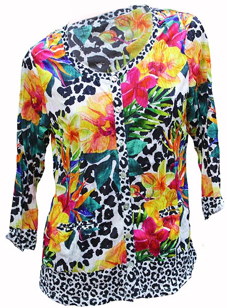 A super soft crinkle polyester button front top/cardi in colourful tropical print and trimmed with black/white leopard print.