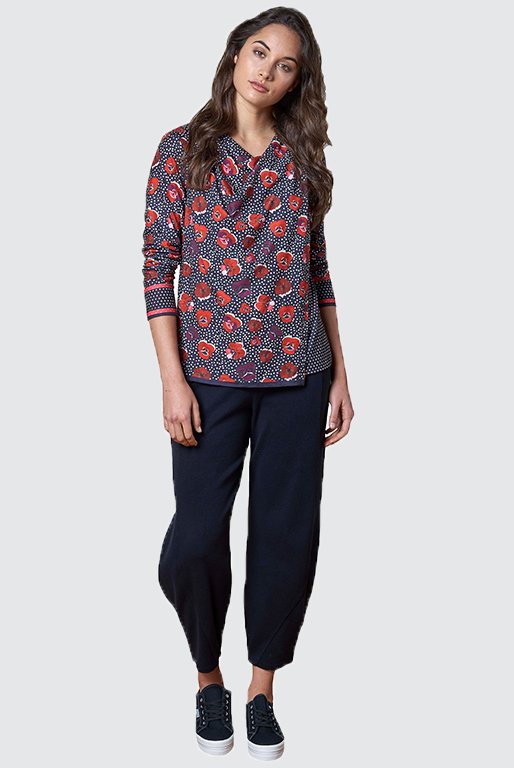 This colourful pansy print top features a flap front and cowl neck with a mini spot trim underneath and on the cuffs.