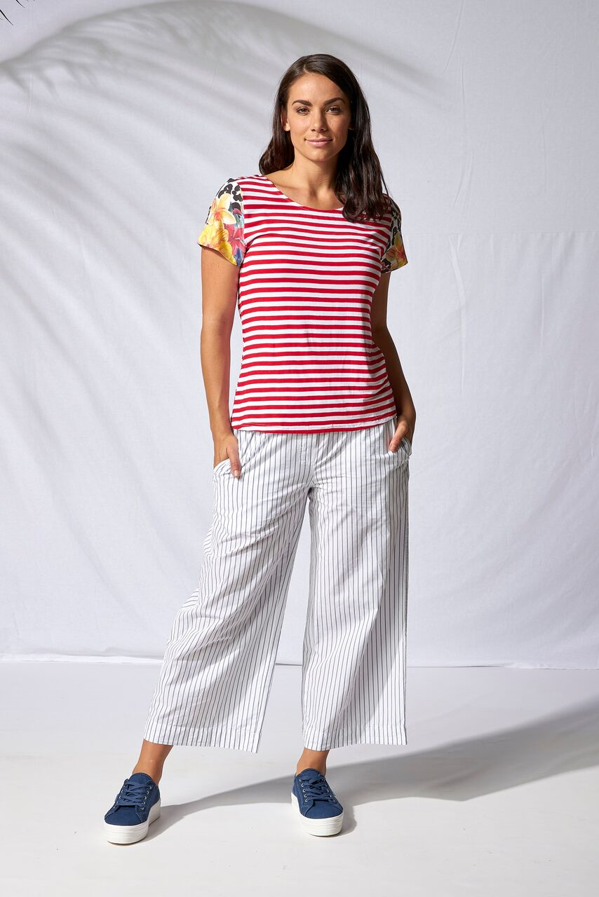 A fun lime and white striped top with contrasting floral short sleeves in a soft stretch rayon fabric. Great with white jeans or shorts and denim.