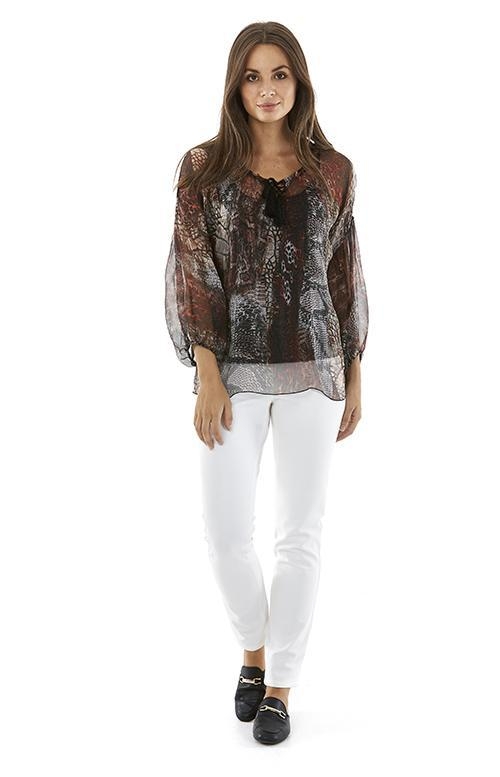 A luxurious easy fit snake print 100% silk blouse with a tassel tie neck and comes with an adjustable strap viscose cami liner.