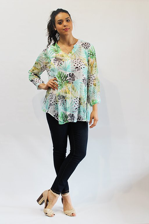 For the lady who likes a bit of cover this is perfect. Long sleeves and long body along with a v neck and button front this ticks a lot of boxes. It is a generous fit with side front pleats and a colour leaf digital print.