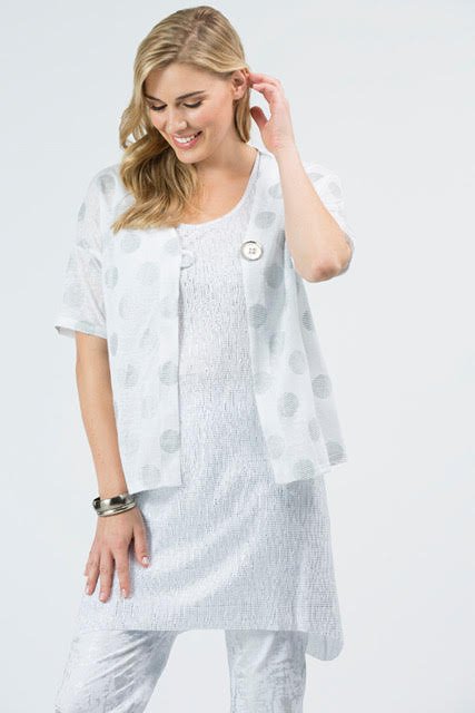 This fun silver stripe/spot cardi with a half sleeve and featured oversize metal button is a great cover up for summer.