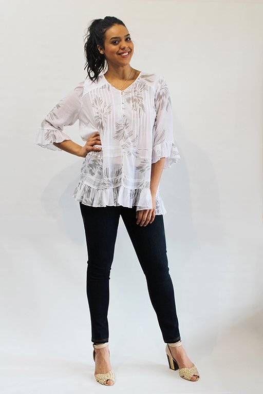 A beautiful floaty, easy fit top with flattering 3/4 sleeves and vee neck. The ruffle detail on the sleeves and hemline make it very feminine top along with the pleating detail and the roulette buttons.