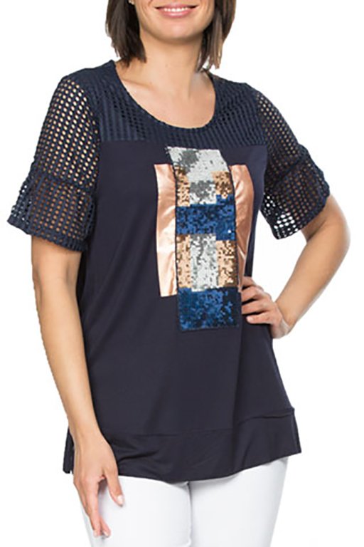 A dresst top with eyelet fabric yoke and sleeve including a frill edge. The body is a longer line viscose with contrasting silver, blue and copper sequin panels and outlined in copper metallic side strips. The hem has a band with side split allowing extra room.