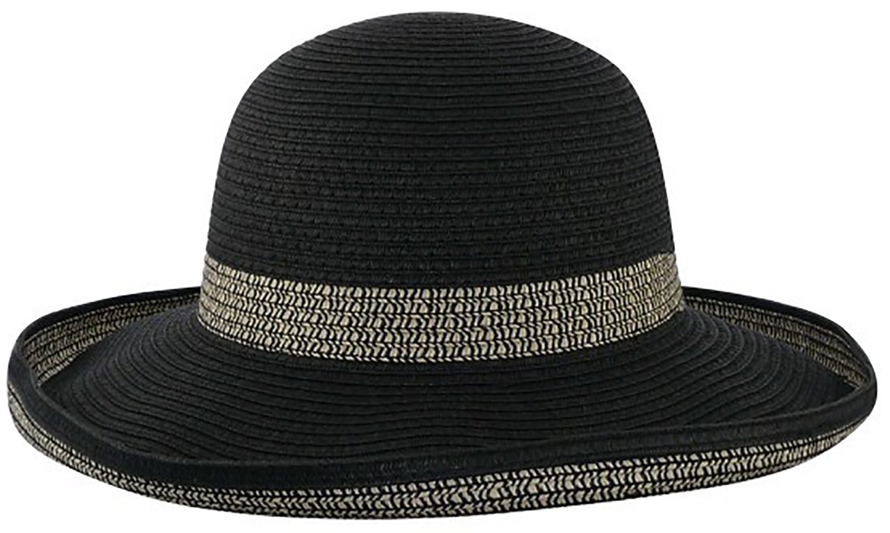 Elegant black and natural 2 tone sun hat with up-turned brim.
