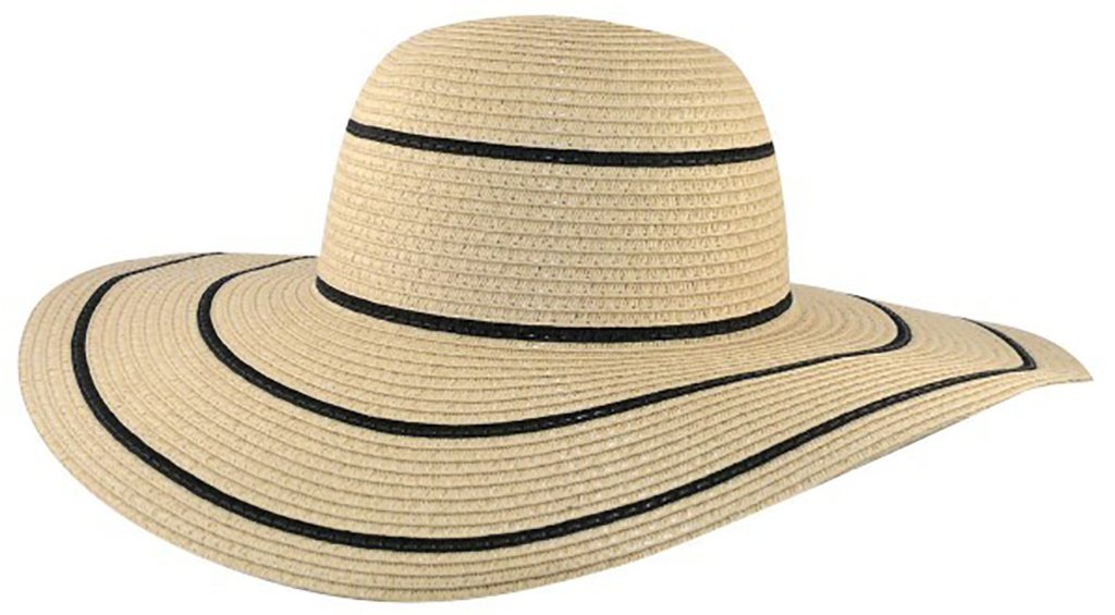 Wide, floppy brim sunhat in natural cream tone with black stripe detail.