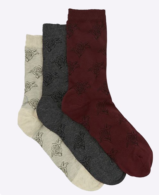 A three-pack of mid-calf length crew socks from Columbine, crafted from breathable cotton-blend fibres, and perfect for everyday wear. Each pair has a plain toned background, and an all-over flower outline detail.