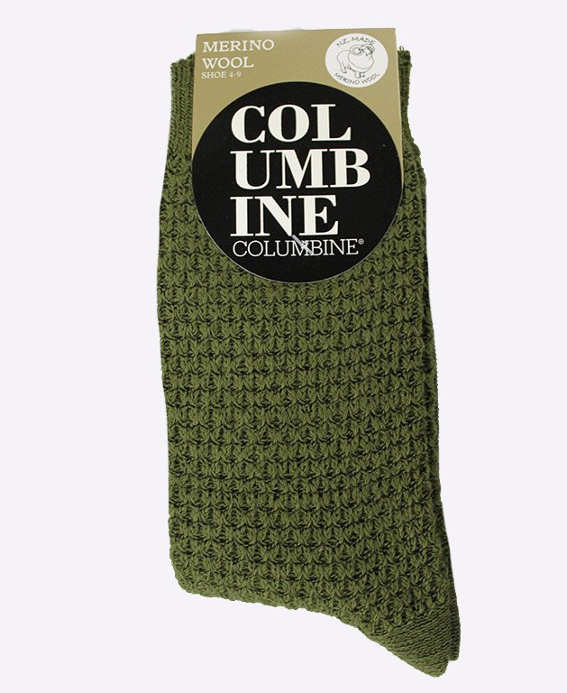 This thick mid-calf length socks by Columbine with a merino wool blend, featuring a textured diamond look.