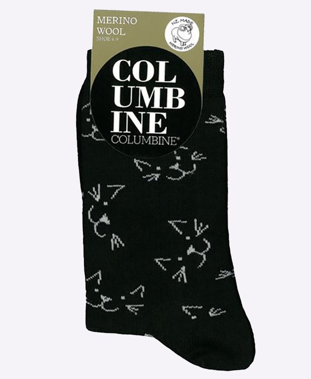 Add a fabulous feline feature to your everyday attire, with these kitty face fshion socks from Columbine. Crafted from cosy merino-blend fibres, they also have a mid-calf length, and a black background tone.