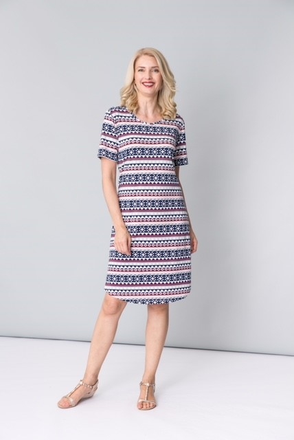A smart short sleeved horizonatal print dress with a shaped hemline. It has a scoop neck and a realxed fit.