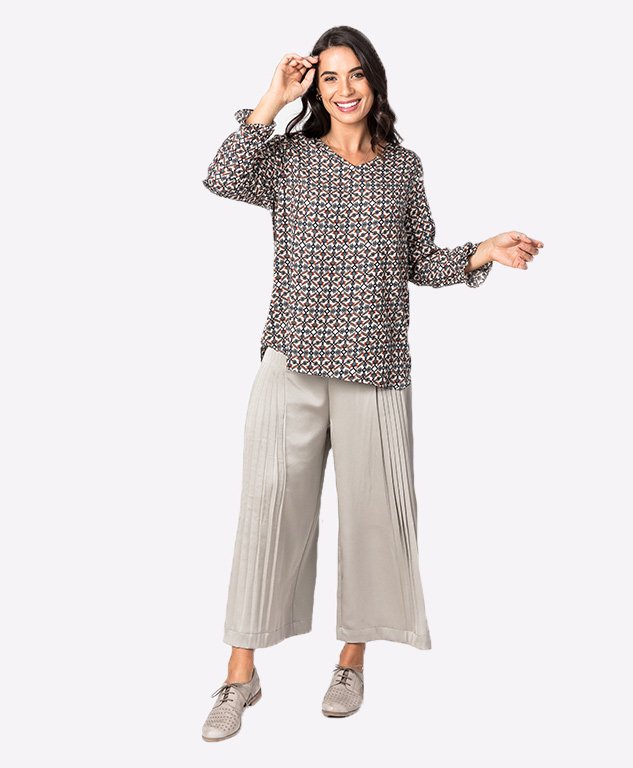 A flattering top with a v-neck featuring a frill cuff at the sleeve and across the back