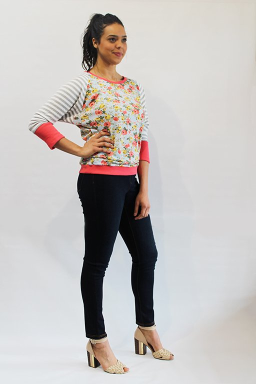A fun 3/4 sleeve top with a scoop neck in a mix of fabrics in woven and knit.