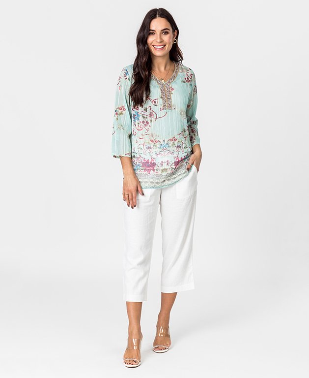 With a jewel trimmed vee neck, this beautiful light pastel print top oozes elegance. With a generous 3/4 sleeve and a loose fitting body, this is sure to fit most shapes and sizes.