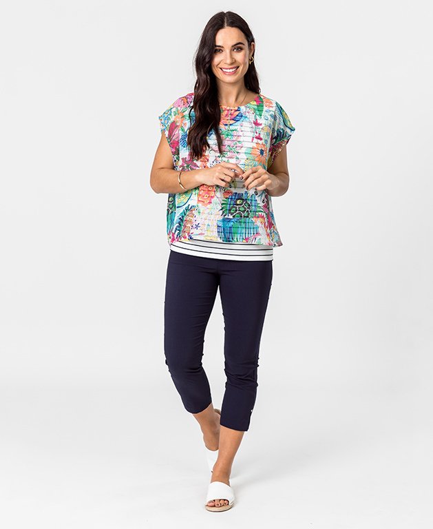 Democracy Top Print Chiffon/Stripe Cap Sleeve Top - Brands-Ladies : Yarntons | New Zealand’s Trusted Fashion Retailer Online - Democracy SS19