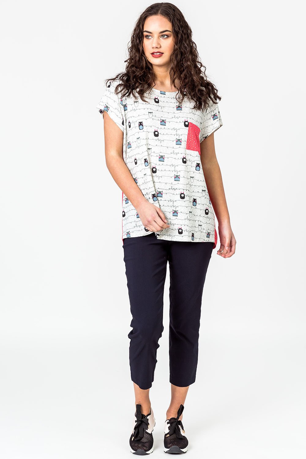 A fun owl print cap cleeve top with contrast back and pocket in stretch rayon. A relaxed, easy fit with scoop neck.