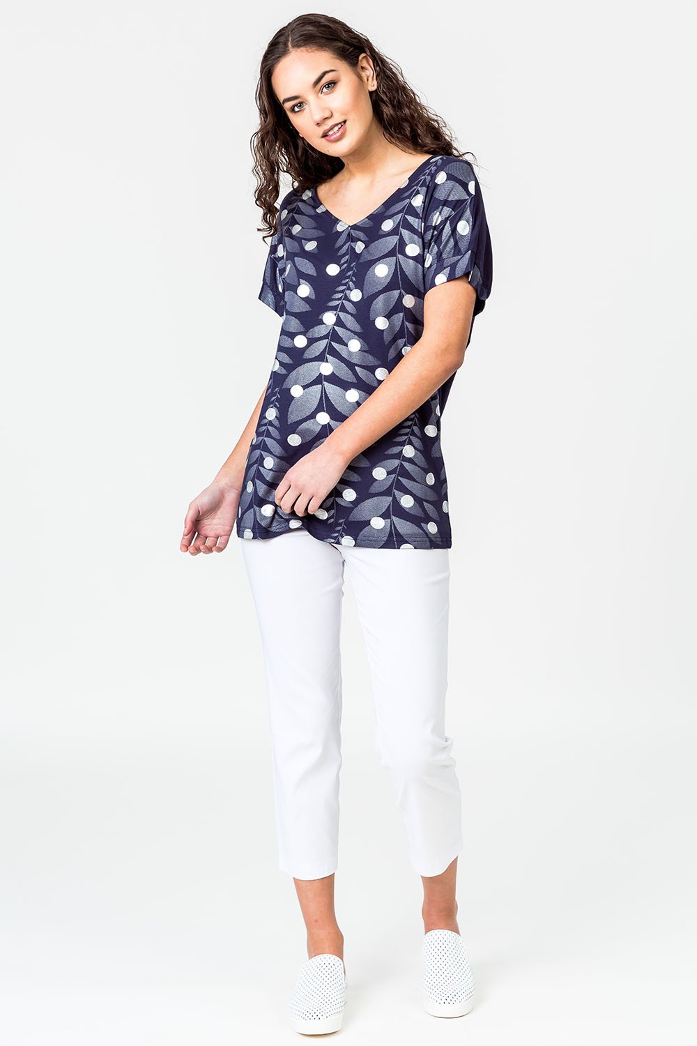 Navy stretch cotton/rayon short sleeve v neck top. Plain back with silver foil sport and leaf print front in a relaxed fit perfect for any occasion.