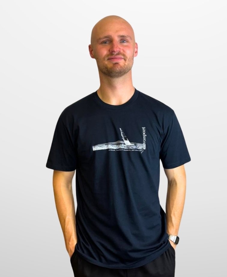 Designed in Devonport, this unique Devo-tee is an image of an America's Cup yacht sailing along with Rangitoto Island in the background.