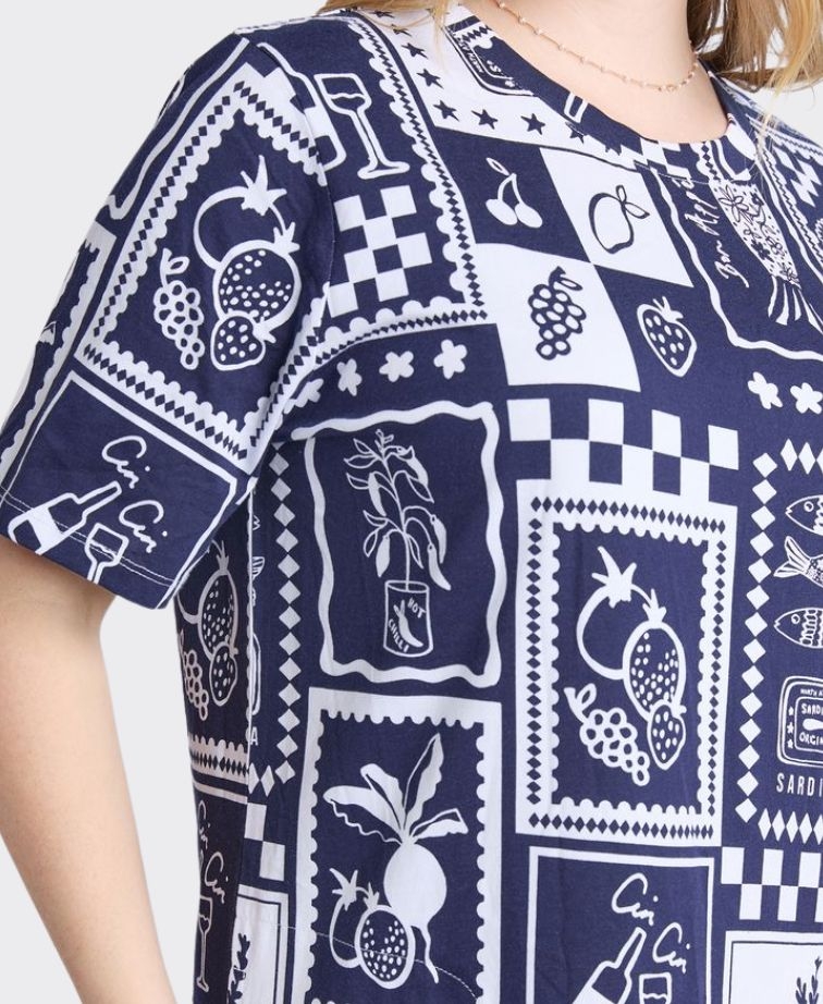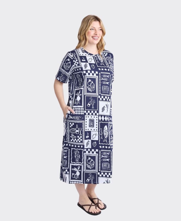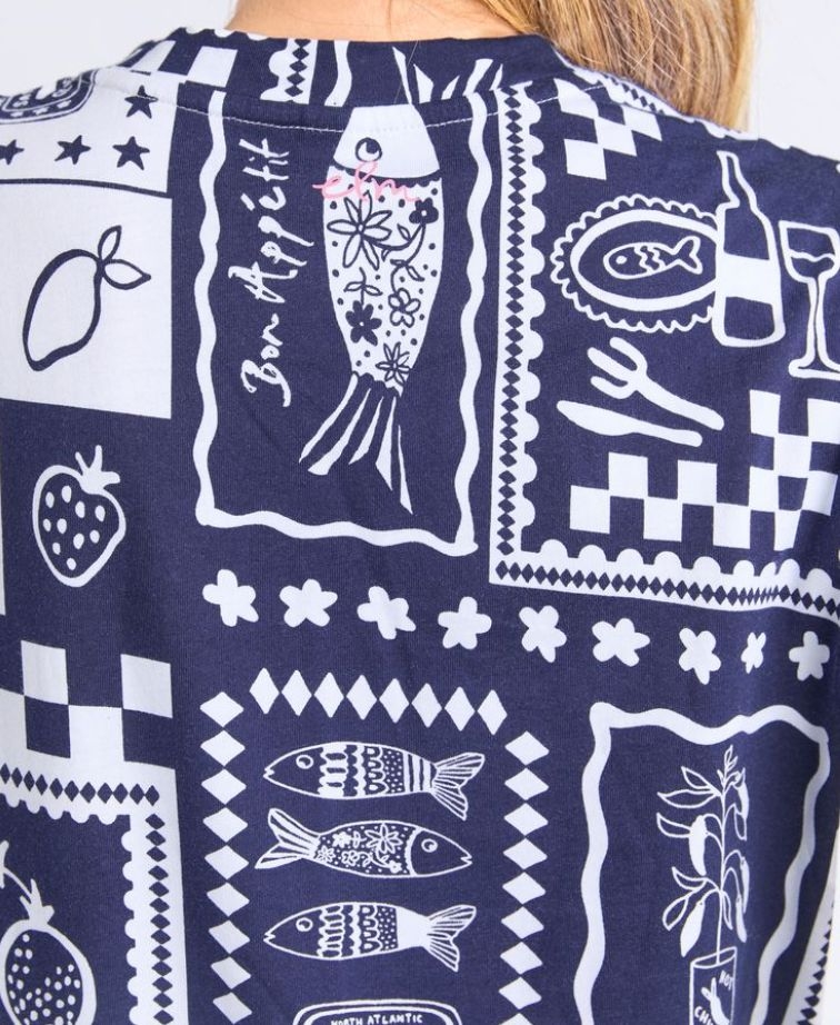 Bring a touch of holiday spirit wherever you go with the Elm Chin Chin Dress. Featuring a playful tile-inspired print and an effortless T-shirt silhouette, this dress is perfect for market mornings, leisurely lunches, or exploring in the sun. Just add white sneakers and you're set for an instant summer mood.
