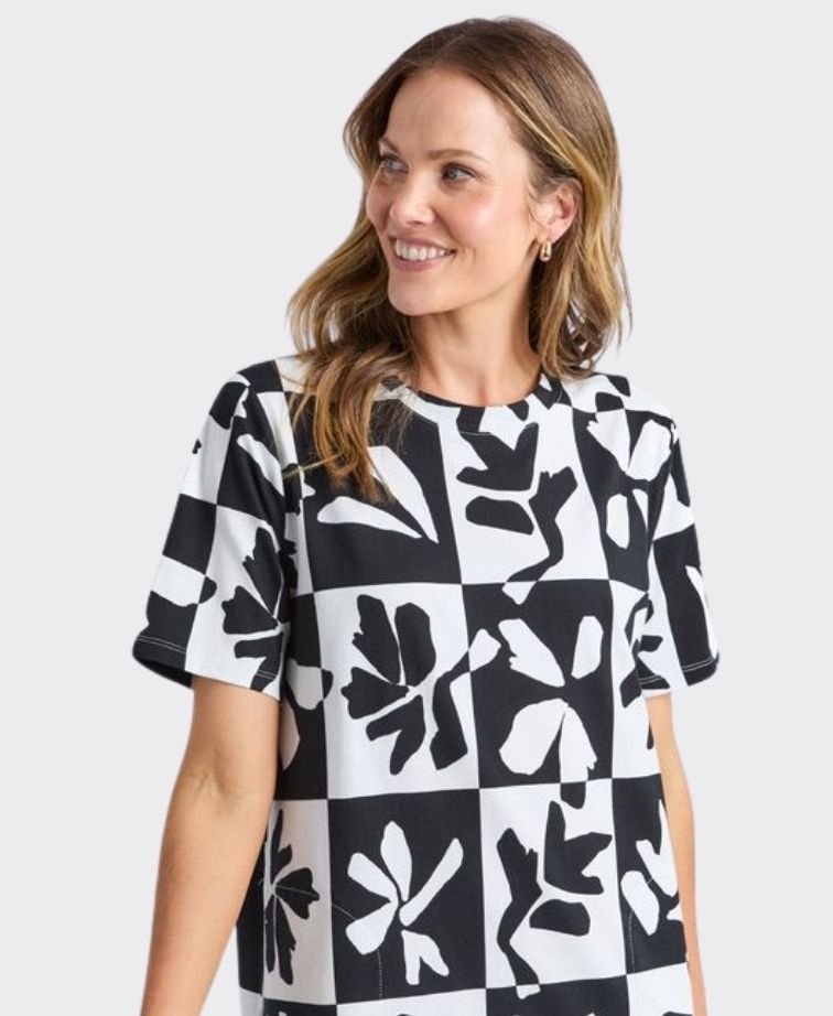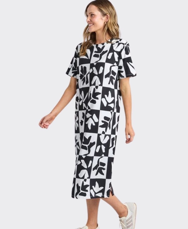 Featuring an exclusive Elm Print in timeless black and white, the Splice Dress is an effortless piece for everyday wear.