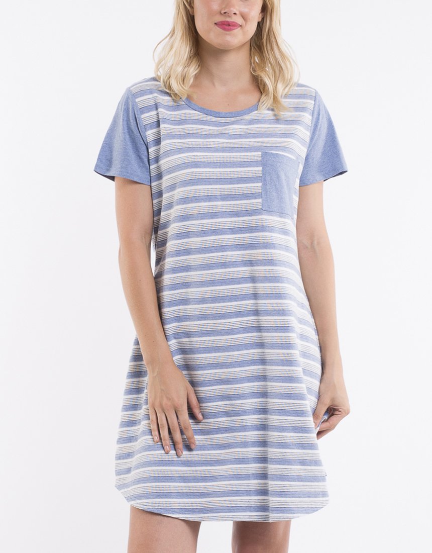 The Winnie Tee Dress is made from jaquard yarn dye stripe jersey. It is a classic style with solid coloured sleeves and feature pocket, it will become a staple within your wardrobe.