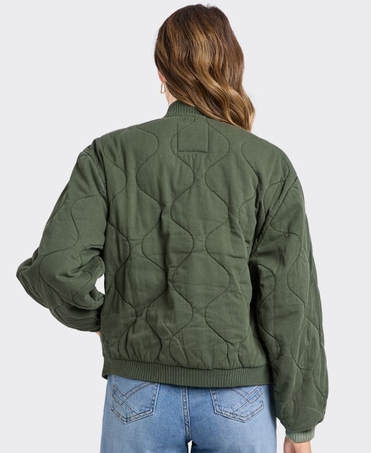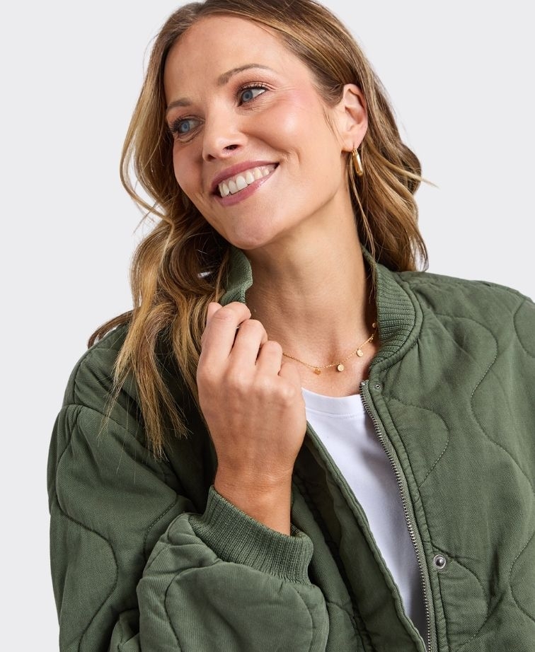 The Elm Jean Bomber Jacket is a relaxed, casual layer perfect for everyday styling. Crafted from 100% cotton with a pigment-dyed finish, this jacket features a ribbed collar and quilted detailing for subtle texture and interest. Wear it over tees, knits, or dresses for effortless, cool-day layering.