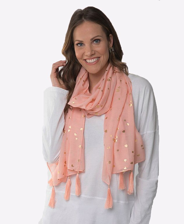 The Metallic Blossom scarf is a beautiful lightweight scarf in a sweet blush pink with gold speckles and pink tassles. 100% Polyester.