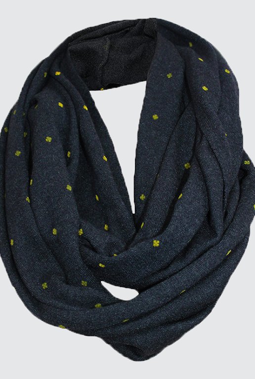 This cosy circular scarf is so soft and easy to wear. It can be twisted up to shorten and wear closer to your neck or less twisting for a longer look. Made from nylon/viscose/wool mix this scarf will wash and wear well and add style and warmth for those chilly days in a soft black colour witht iny yellow flowers.
