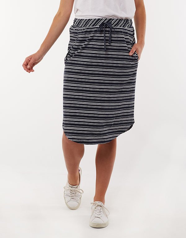 The Fundamentals Isla Skirt is made from a yarn dye stripe slub jersey. It’s a flattering length just below the knee and has a curved hemline and elastic waist for comfort.