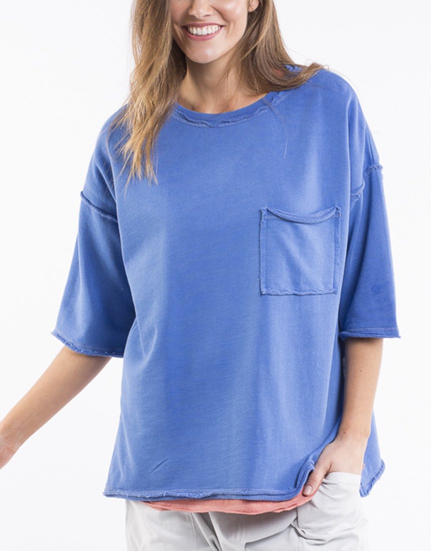 The Adelaide pullover is made from cotton fleece, has a crew neckline, elbow length sleeve and raw edges. The garment is pigment dyed to give a washed look and soft handle.