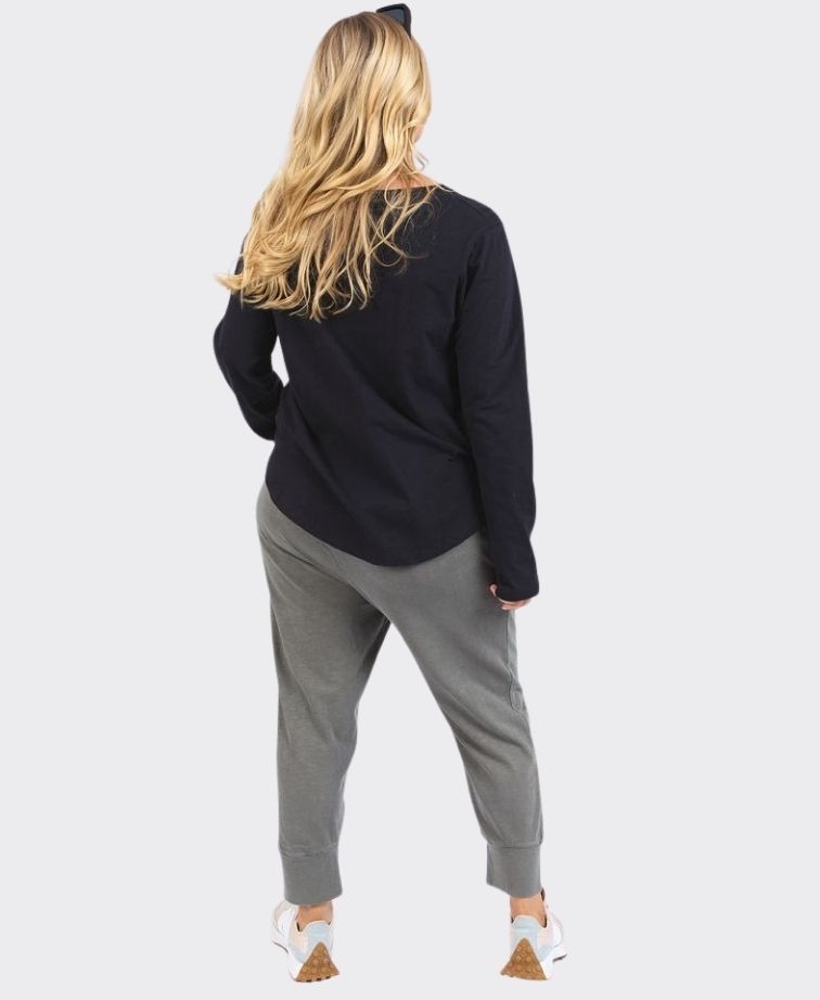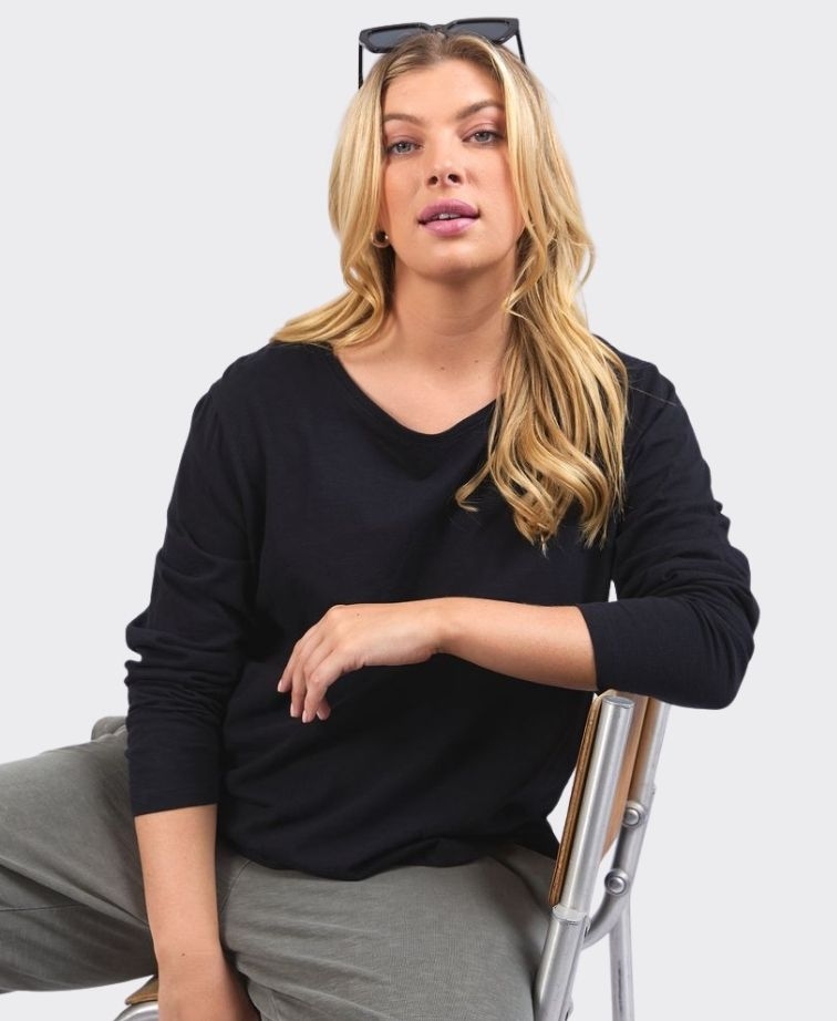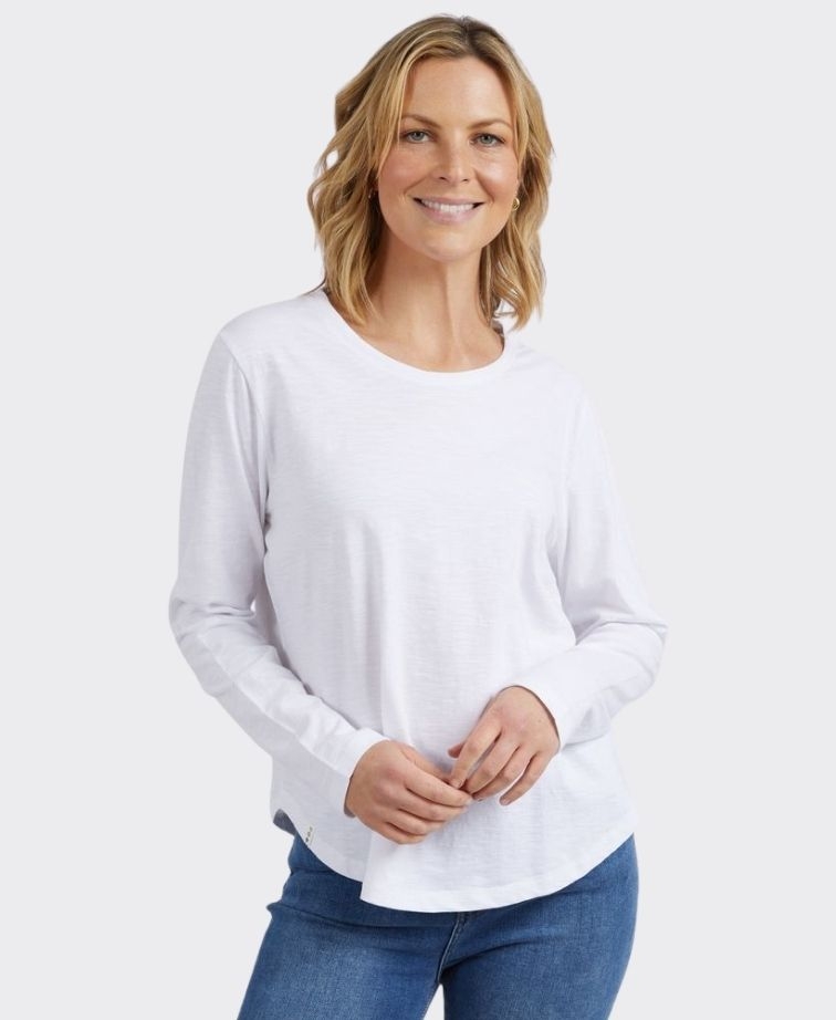 A basic with style – the Elm Everyday Long Sleeve Tee is a versatile wardrobe essential. Crafted in soft cotton, it’s perfect for layering under your favourite crew or wearing alone as a relaxed, stylish piece. The scooped hem and classic round neckline make it an effortless addition to any casual outfit.
