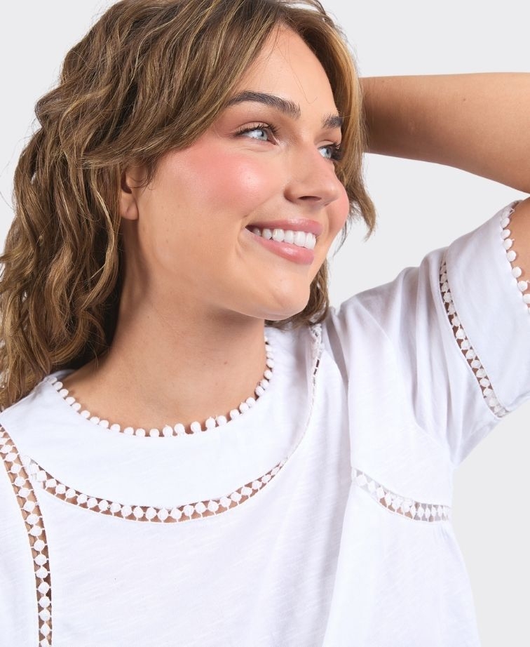 The Elm Abagail Lace Trim Top is a breezy, relaxed piece perfect for effortless everyday style. Made from soft cotton slub jersey, it blends casual comfort with luxe detailing.