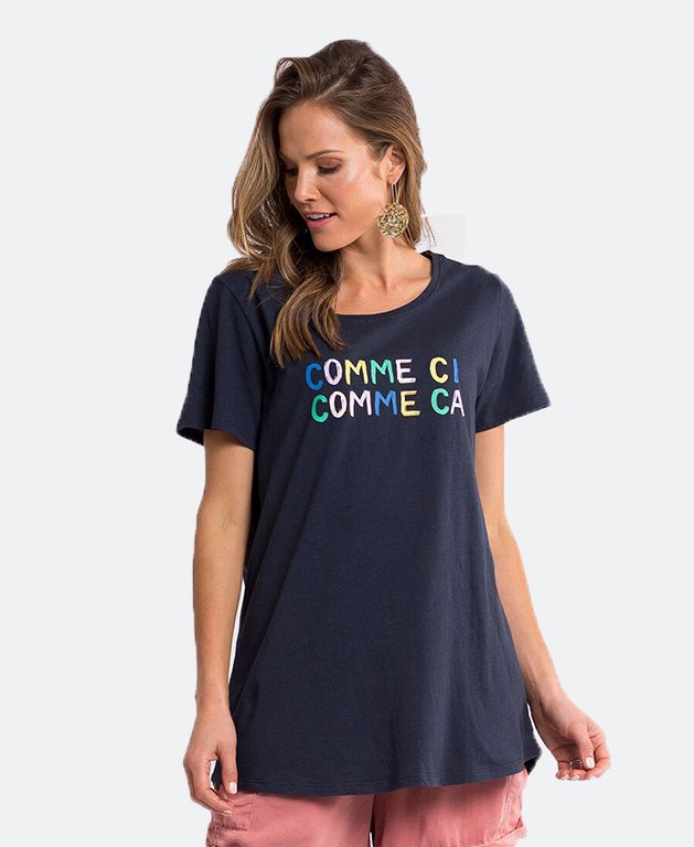 This cute printed 'Comme Ci Comme Ca' top is your next comfortable go-to graphic tee this season!