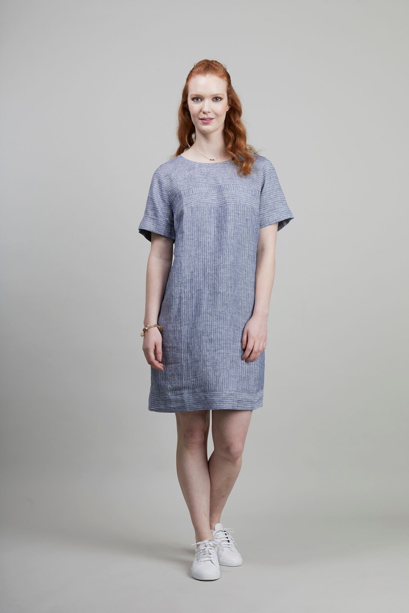 Short sleeve empire line striped linen dress