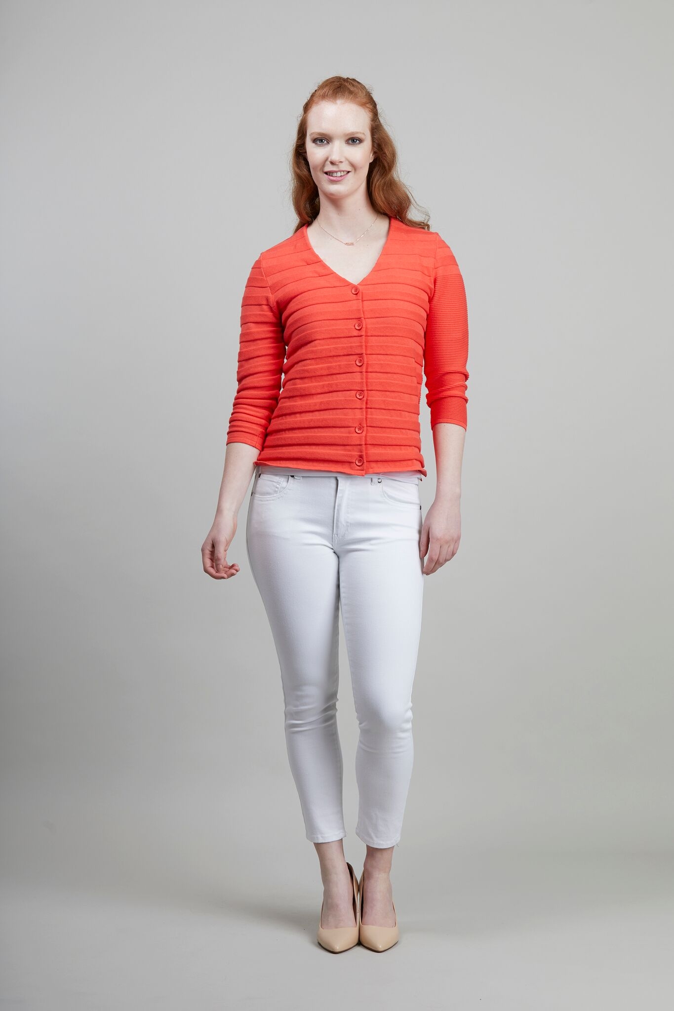 100% Cotton multi rib v neck cardi . Cotton knit multi rib button cardi in stunning watermelon colour.
