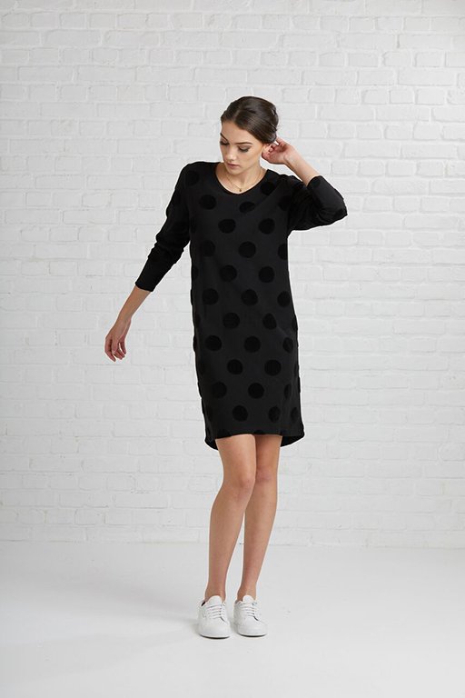 Long Sleeve Dress Easy Fit Round Neck Up down hem Fun Flocked Spot Pattern