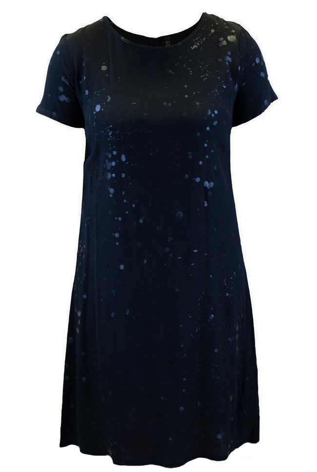 Stunning short sleeve black dress in a shimmer print fabric simulating water droplets. The pleat feature at the back makes this garment an elegant flowing fit perfect for any occasion.