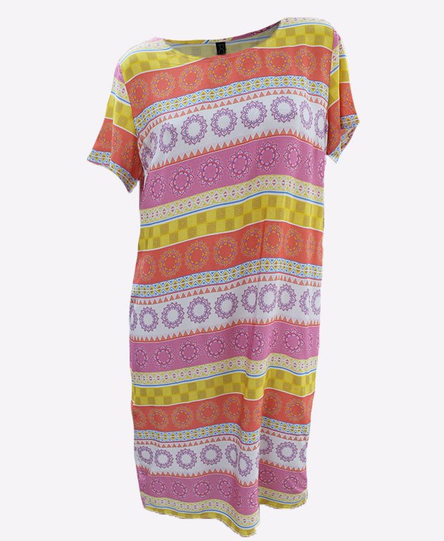 The everyday dress which is great to dress up or down everyday of the week. Featuring two fun and colourful prints, this shift style with short sleeves and chiffon floaty nature will keep you cool this summer.