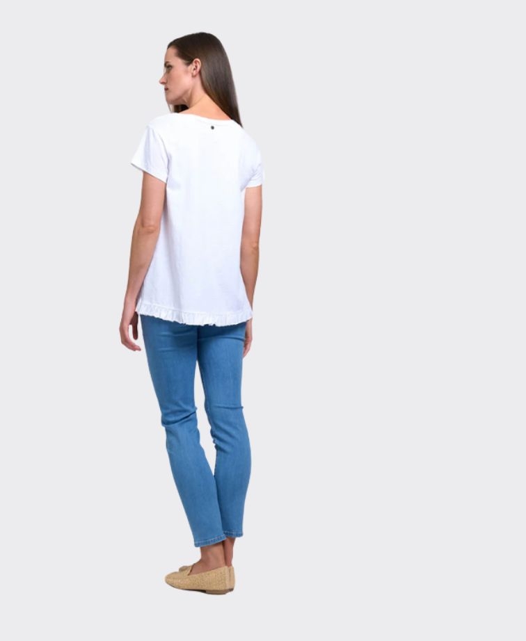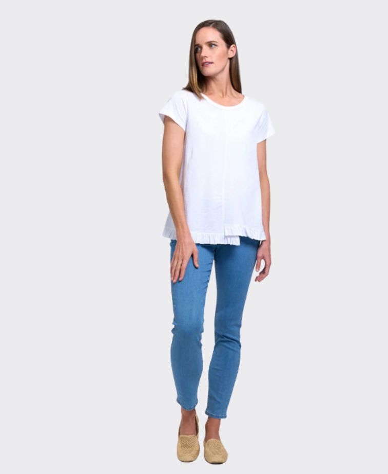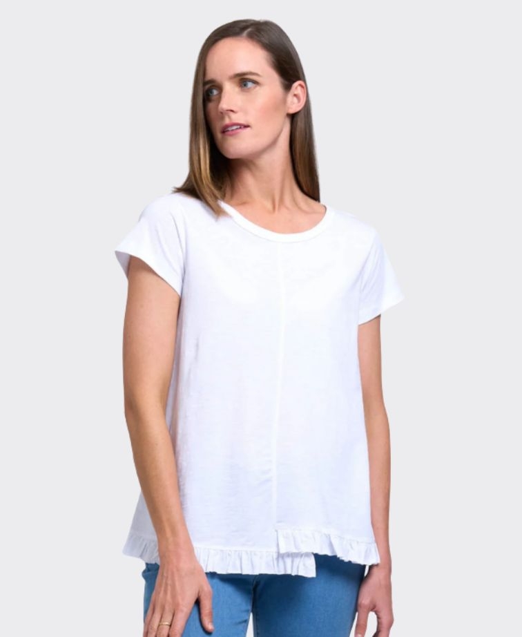 A relaxed-fit summer essential, this scoop-neck tee features a playful asymmetrical frill step hem for added style. Perfect for casual days or layering with your favourite pieces.