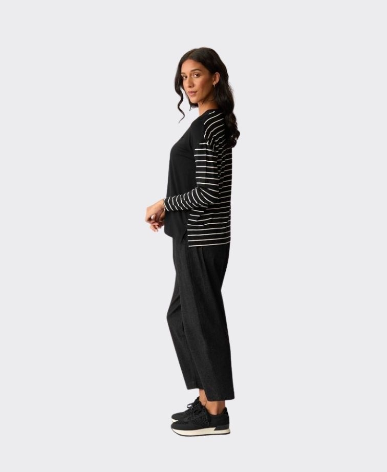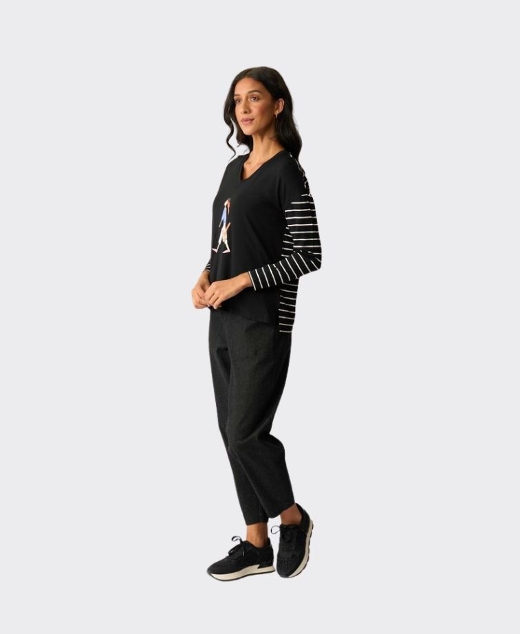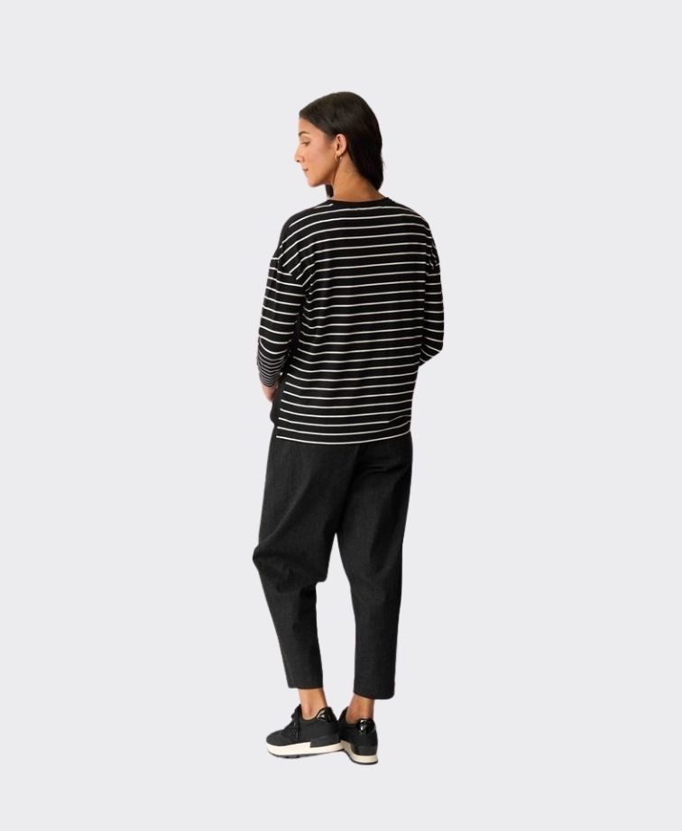 The Combo Print Top by Foil is a stylish and versatile knit designed for everyday wear. Featuring a plain front with stripe detailing on the back body and sleeves, this top blends classic and contemporary elements. The V-neckline, full-length sleeves, and side splits create a relaxed yet flattering fit. With a body length of approximately 63cm from shoulder to hem (size Small), it’s perfect for layering or wearing on its own.