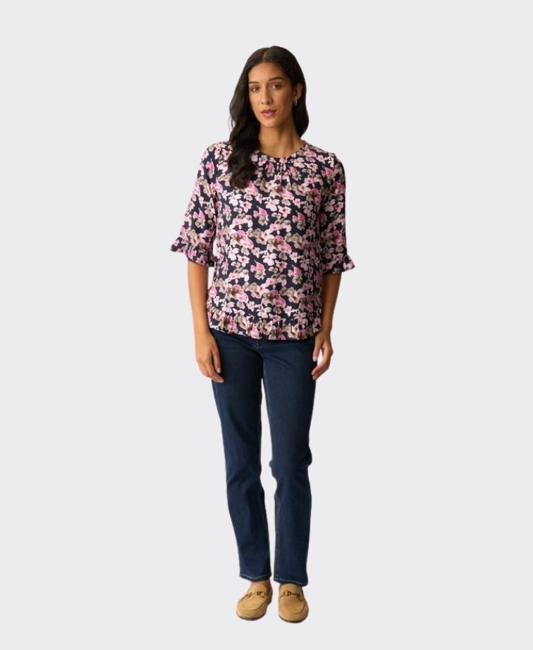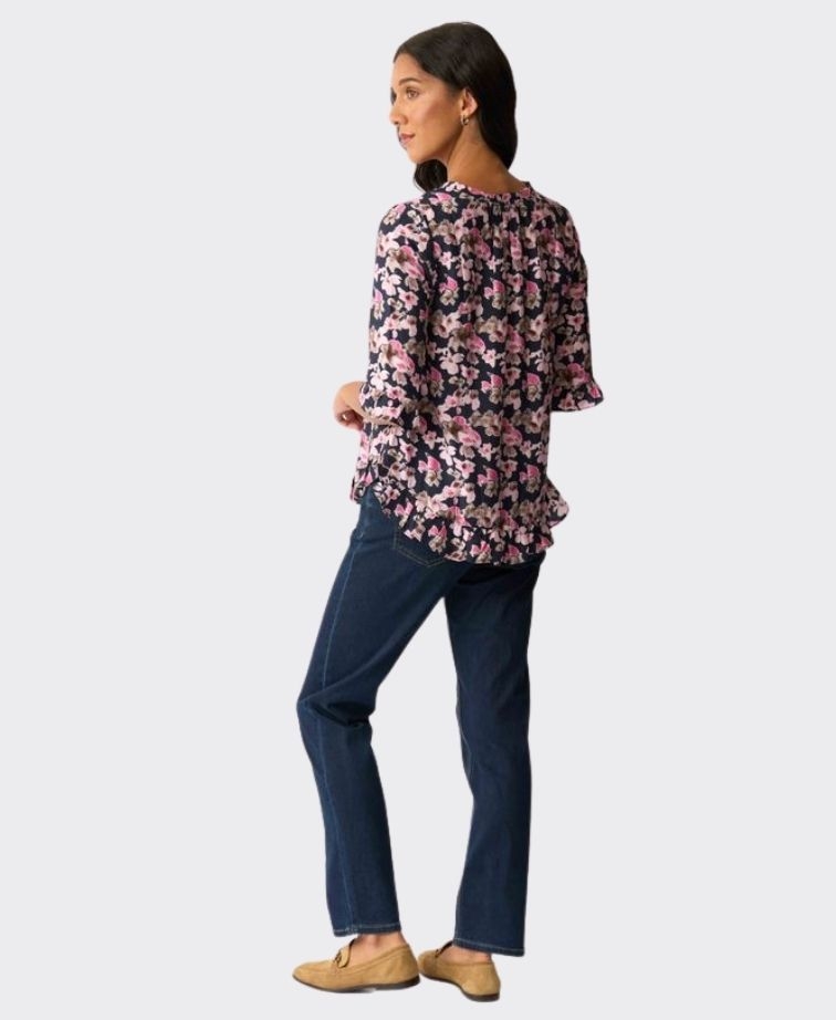 The Gathered Scoop Hem Top by Foil is a soft, feminine style designed for effortless everyday wear. Featuring a flattering scoop neckline and relaxed silhouette, this top is finished with delicate ruffle detailing at the cuffs and hem for a playful touch. The 3/4 sleeves make it an easy trans-seasonal piece, while the fluid fabric offers comfort and movement.