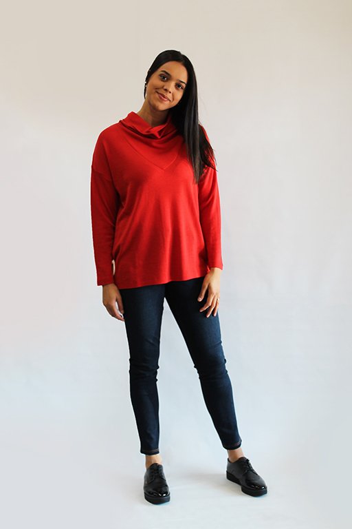 Fabulous casual merino top with cowl neck and vee yoke.