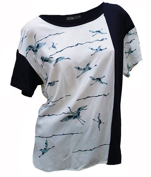 Striking bird print top in a combination of cotton knit with woven viscose panels and sleeve. A rounded scopp neck with a slight drop shoulder for an easy flattering fit.