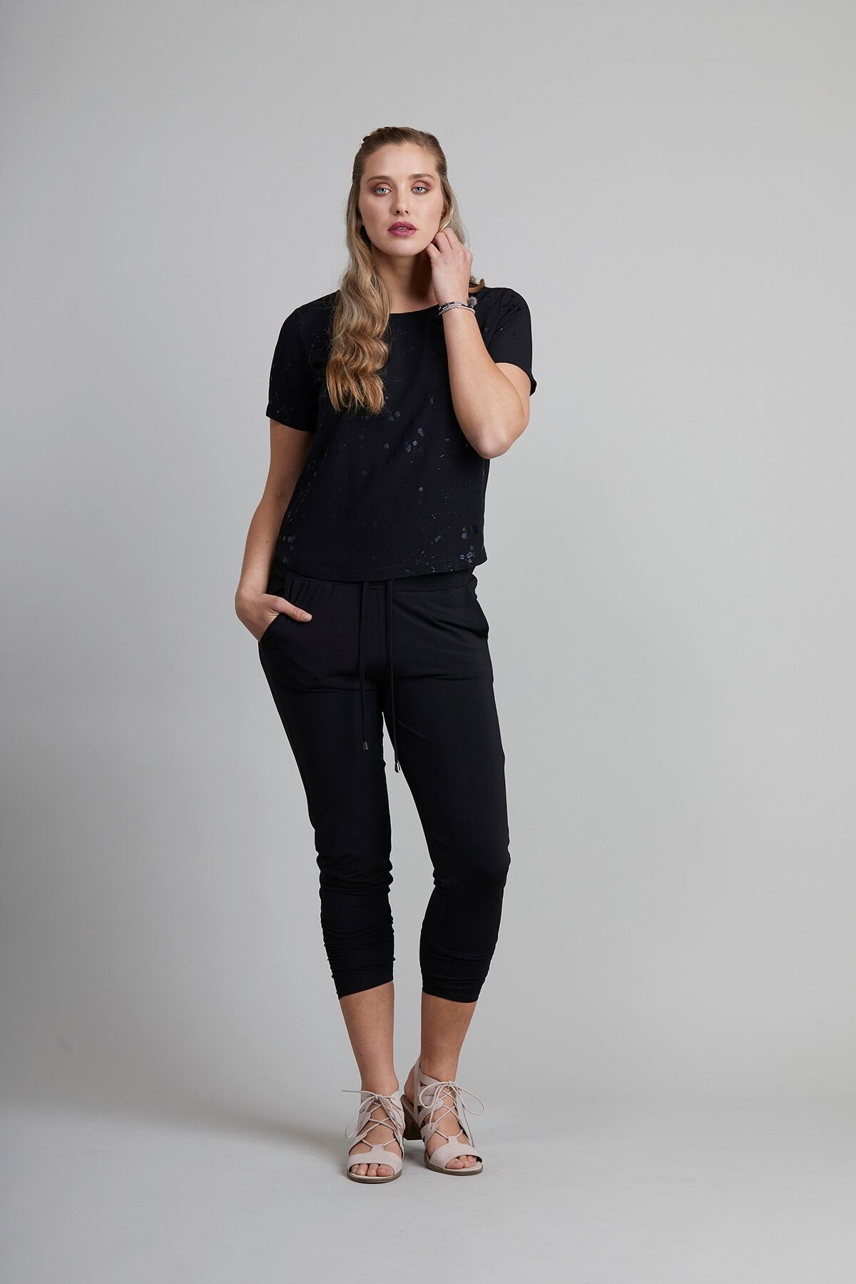 Loose fit flattering black top in a stunning shimmer print simulating water droplets. Easy care crepe fabric with shaped hem and chest pocket detail.