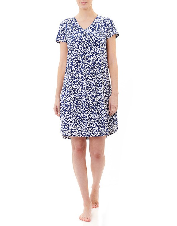 Ideal summer nightie in royal and white 'Arianna' print. This Bamboo Cotton mix knit is a wonderful soft and cool fabric, perfect for summer nights. This cap nightie has a self vee neck band, front and back pleat, and a neat curved hem, shaped at the sides.• 45% Bamboo/50% Cotton/5% Elastane• Length : Size S = 95cm