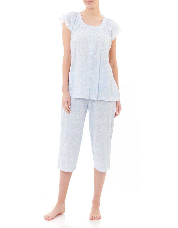 Fresh blue floral printed on beautiful 100% cotton knit jersey. This Capri Pyjama is a very popular choice for warm summer nights. This capri pyjama has a lovely round neck with gathers at the centre front and sleeve head providing a feminine soft look, and comfort of movement. The cap sleeves have a pretty lace motif. The pyjama has a full button front opening, and pockets. The pants have a soft elastic waist, and a self drawstring.