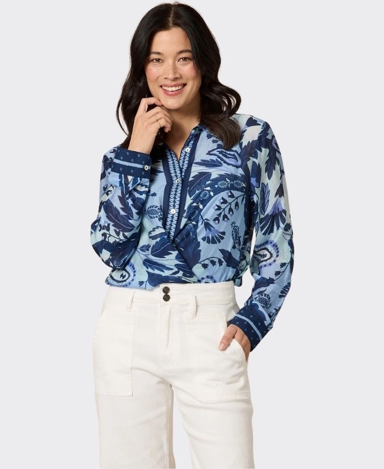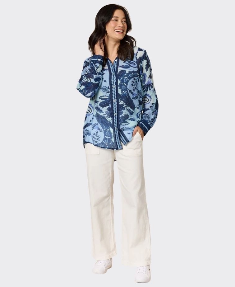 Crafted from a semi-sheer fabric, it’s ideal for layering over a cami while maintaining an airy, elegant look. The signature button-through front is complemented by contrast trim detailing on the placket and cuffs, while a flattering curved hem completes the silhouette.