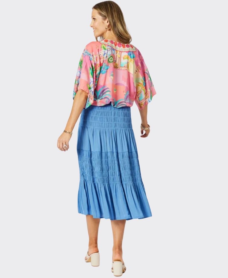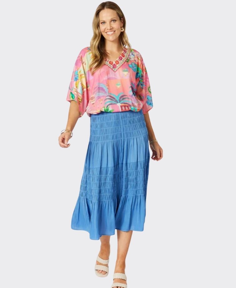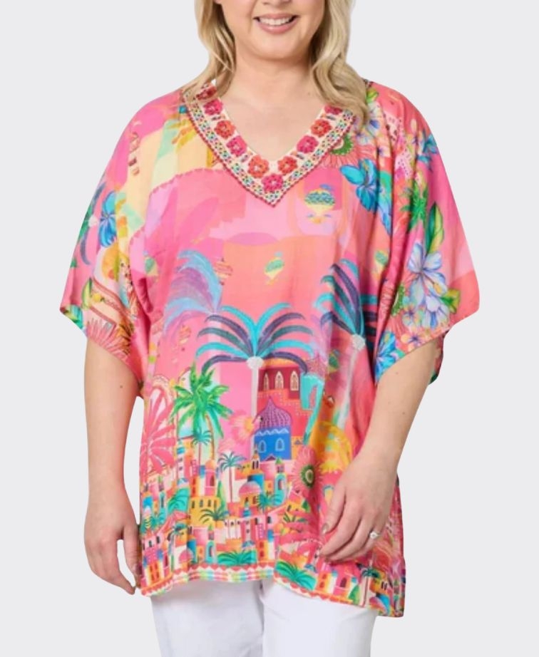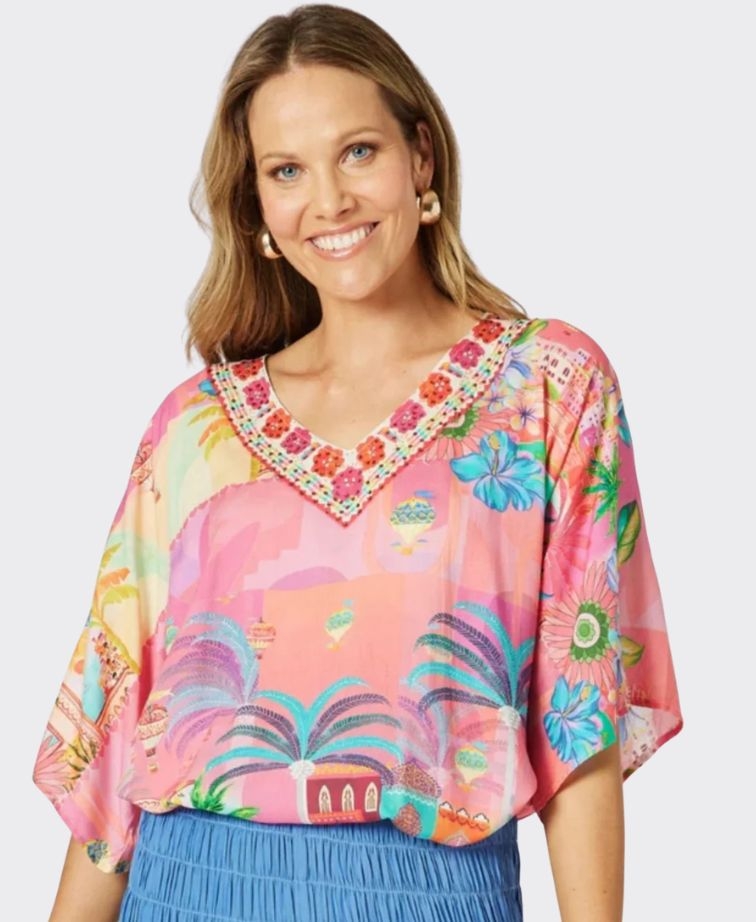 Styled in an exclusive vibrant print in sunset-inspired hues, this relaxed-fit top is your ticket to effortless holiday dressing. The soft, lightweight viscose fabric flows beautifully, while the embellished V-neckline adds a touch of glam. Finished with contrast border detail, it’s perfect to pair with the matching pant or your go-to white denim for a fresh, resort-ready look. Fashion that never goes out of style.