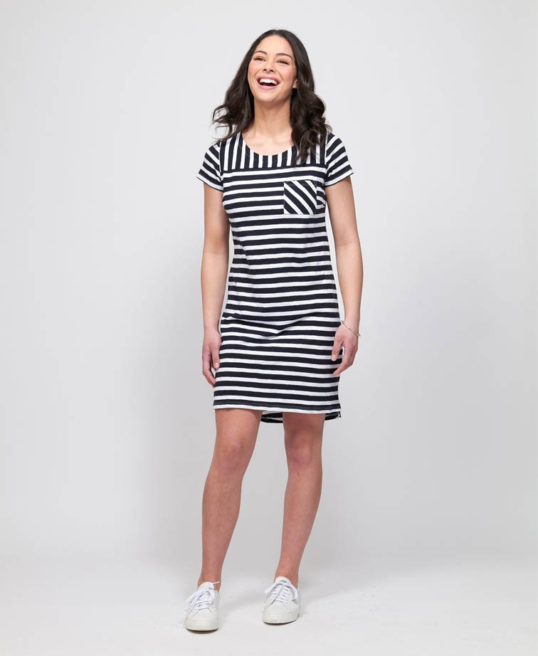 Cotton slub stripe shift dress Pocket to the front with a diagonal stripe Exposed zip to the centre back neck Up down hem & scoop neck Body length from the shoulder to the front hem is approx. 93cm & to the back hem is approx. 98cm (size M)