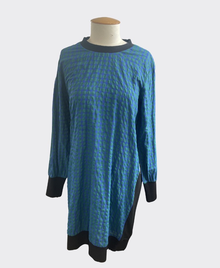 The Contrast Detail Dress by Memo is a stylish winter dress designed with thoughtful fabric contrasts for a modern silhouette. Featuring a printed woven front and a plain knit back, this dress combines texture and movement for an effortlessly chic look. Full-length sleeves gather into ribbed cuffs, while ribbed detailing at the neckline, cuffs, and body hem adds a polished finish. The body length from shoulder to centre front measures approximately 97cm (size 10), creating a flattering shape suitable for both casual and dressy occasions.