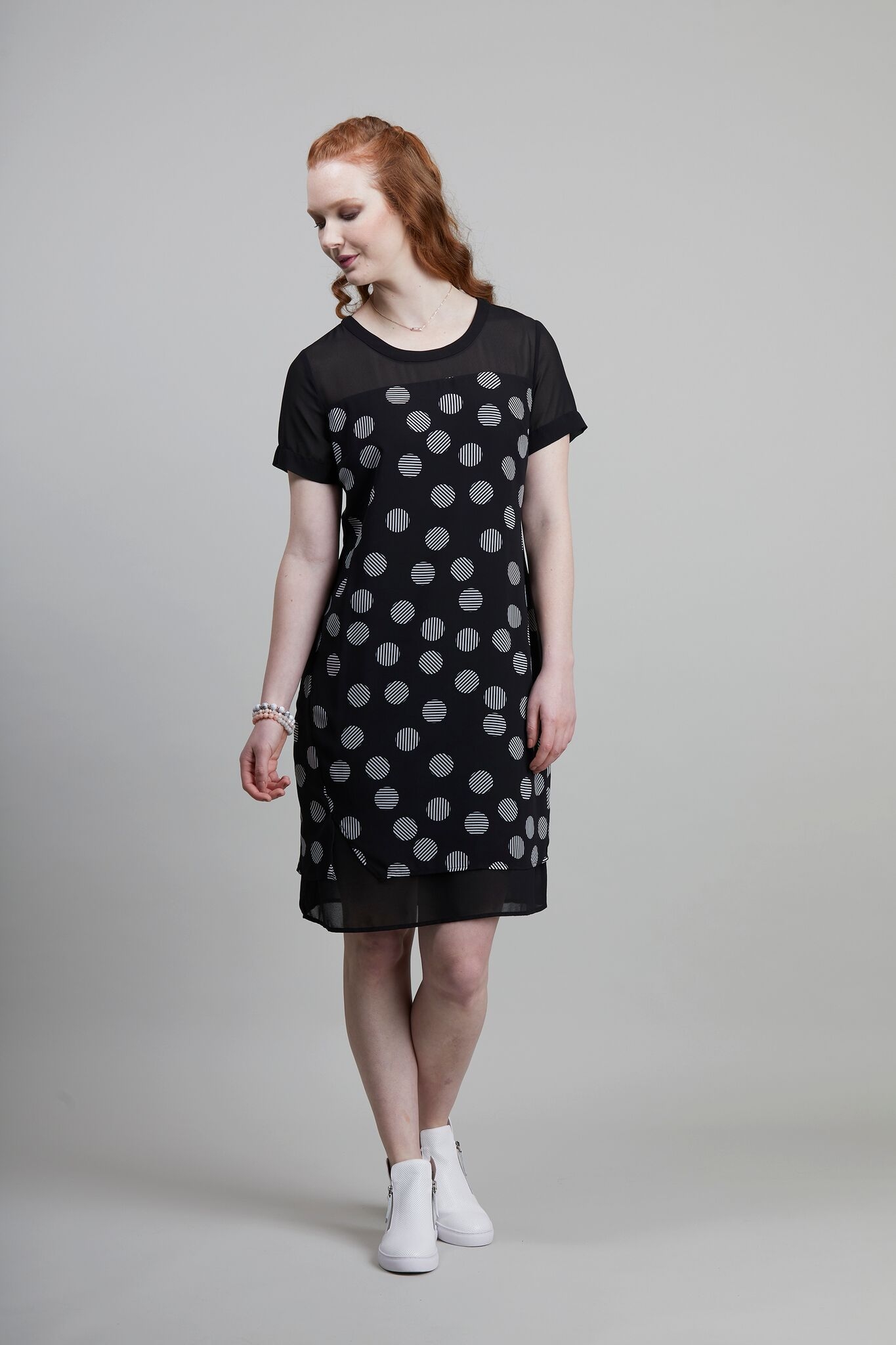 Overlay print floaty chiffon dress with contrast plain yoke and layered hemline. With a generous short sleeve and flowing body this is a dress that ticks all the boxes.